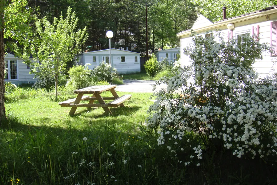 L’extérieur du mobil-home est équipé d'un salon de jardin en bois avec parasol.